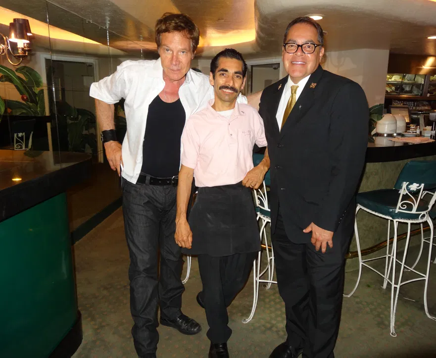 Mark congratulates server Eucario Avila for 30 years of dedication to both hotel guests and local regulars at the Fountain Coffee Room at the Beverly Hills Hotel. Monday, July 13, 2015, was the 30th anniversary of Avila’s first day at the Fountain Room, and through his methodical attention to detail, he’s been providing first-rate service ever since. An admirer of the food, the service, and the classic Paul Revere Williams design, Barron has been a regular for over 30 years. Pictured with Mark are server Eucario Avila (center) and Concierge Extraordinaire Stephen Martin.